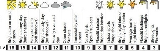 LV0 er svarer til en lysmængde som giver korrekt eksponering af en ISO100-film ved blænde 1.0 med en lukkertid på 1 sekund; det er et ret svagt lys i almindelige sammenhænge.
